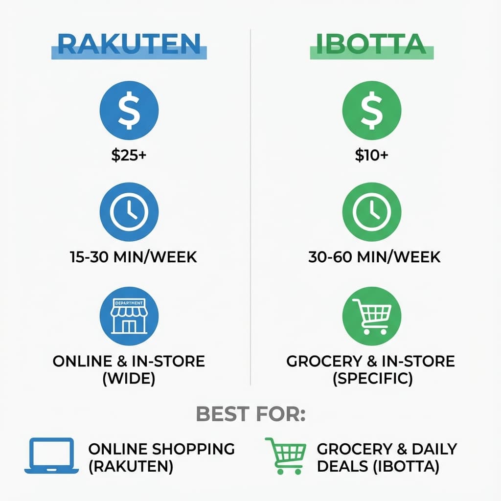 The short answer: it depends on how you shop. Rakuten wins for online shopping. Ibotta wins for groceries. The real winner? Using both strategically.